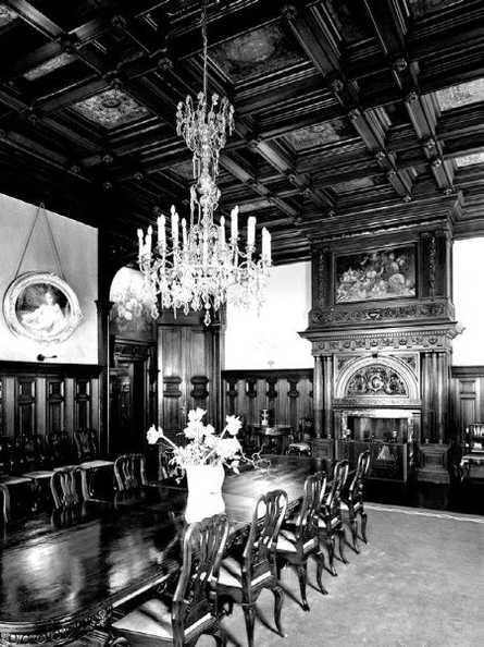 Великолепная парадная лестница из мореного дуба, ведущая в верхние жилые покои, создает ощущение присутствия в готическом средневековом храме. Готический дух витает и в некоторых залах, где господствуют деревянные резные панели, мощные порталы и оконные проемы, украшенные остроконечными арками. Центральный холл, выполнен в стиле Тюдоров. Здесь все сплошь из дерева: настенные панели, остроконечные резные порталы, ажурные детали сказочного балкона. Атмосферу Средневековья довершают старинные гобелены с рыцарскими сценами, изысканная мебель с потрясающей резьбой и клавесин. В строгом неоготическом стиле выдержан и каминный зал (ныне столовая) с внушительным буфетом, украшенным мощными витыми колоннами.