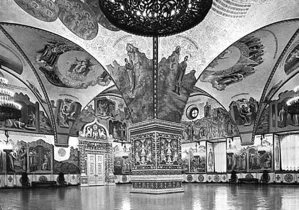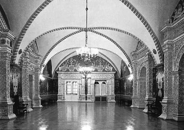 До революции в Грановитой палате под балдахином из золотой парчи стоял резной Царский трон из темного дуба. Сейчас он находится в Оружейной палате. Трон государя стоял, как икона, в красном углу, где соединялись наиболее почетные стороны здания: восточная, ориентированная, подобно алтарям, к области рая и спасения, и южная, смотрящая в сторону Палестины, земной родины Иисуса Христа.