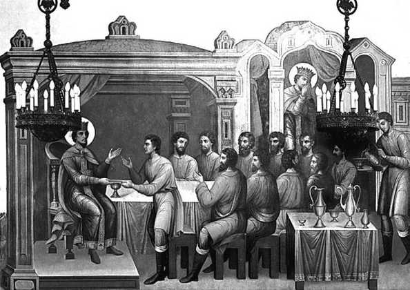 Не менее поучительна роспись, расположенная на западной стене и иллюстрирующая притчу о праведном и неправедном судьях. Праведный судья призвал некоего царя к справедливости, а неправедный, получив взятку – драгоценный кубок и мешок серебра – отправил в тюрьму невиновного человека. Судья развлекается на пиру, а его душа спускается в ад. Сюжет росписи должен быть напомнить каждому, независимо от его положения, о неминуемом Страшном Суде. Примечательно, что все изображения сопровождались пояснениями и поучениями, что помогало во время пышных застолий не забывать и о духовной пище.