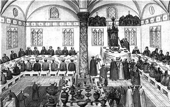 ♦ Интересно, что на столах видных бояр и иностранных гостей стояла позолоченная посуда, на остальных – серебряная. Ножи и вилки до конца XVII столетия были большой редкостью и подавались только для наиболее знатных гостей. Так, иностранец Бухав, присутствовавший на пиру Ивана Грозного, впоследствии писал, что не имел ни тарелки, ни ножа, а пользовался ими от сидевшего подле него боярина.