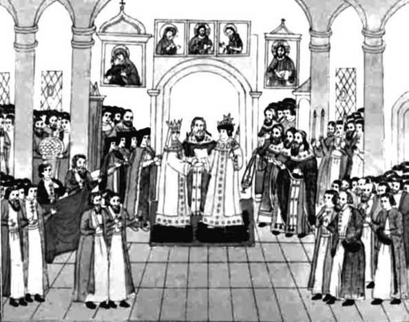 Венчание в Грановитой палате. Свадебная акварель из книги «Описание в лицах торжества, происходившего в 1626 году февраля 5 при бракосочетании Государя Царя и Великого Князя Михаила Федоровича с Государынею Царицею Евдокиею Лукьяновною из рода Стрешневых»