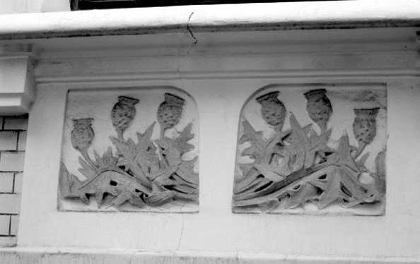 В отделке особняка применена нарядная облицовочная плитка, а прорисовка растительного скульптурного декора отличается редкостным своеобразием. Верх второго этажа украшен бирюзового цвета майоликами, а промежуток между вторым и третьим этажами – рельефными изображениями чертополоха. В христианской символике его колючки символизируют муки Христа, а также земные печали и зло, посягающее на добродетель. Чертополох был объявлен символом первородного греха, тем не менее он считается священным растением и официальной эмблемой Шотландии. В Символике и Геральдике изображение чертополоха означала: «Никто не тронет меня безнаказанно»