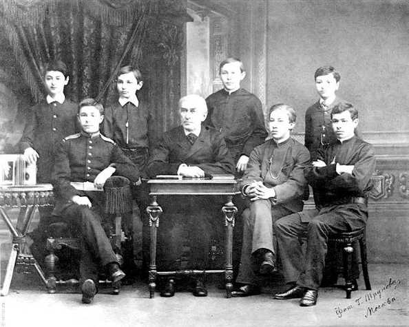 Николай Зверев с учениками, конец 1880-х гг. Слева направо Семен Самуэльсон, Александр Скрябин, Леонид Максимов, Сергей Рахманинов, Александр Черняев, Федор Кенеман, Матвей Пресман