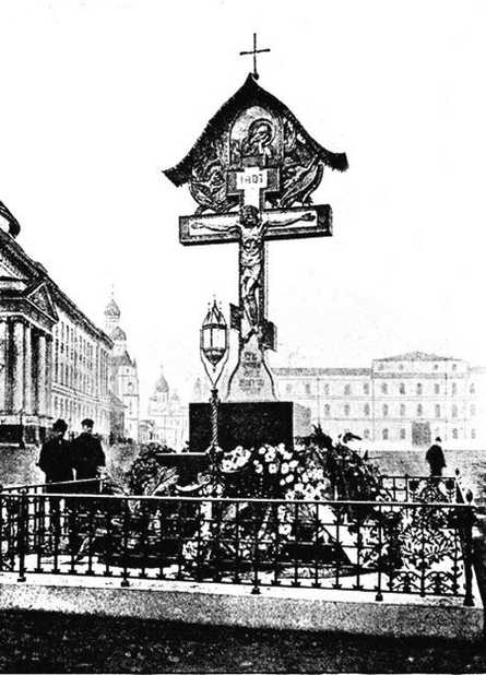 Памятник-крест, сооруженный на месте убиения великого князя Сергея Александровича в Кремле, освященный 2 апреля 1908 г.