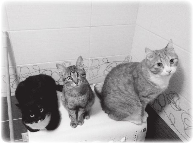 Уставшая хозяйка вернулась домой и зашла в ванную комнату. Через минуту она созвала срочное, нет, экстренное собрание, на которое были приглашены три её питомца.