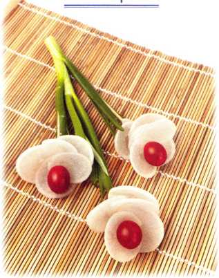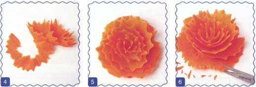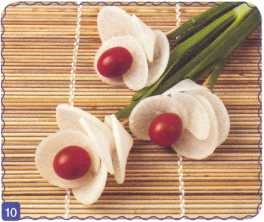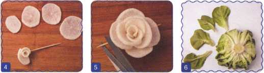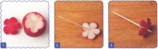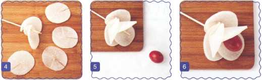 3. Свернуть ломтик редьки трубочкой и проткнуть деревянной шпажкой – это внешний лепесток.