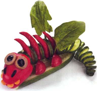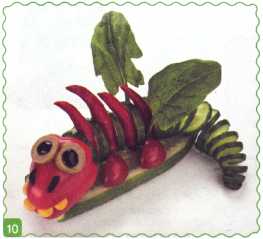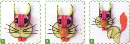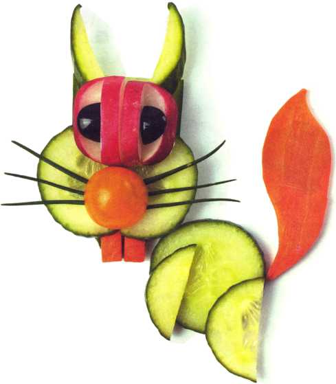 9. Можно сделать туловище: ножки – из кружочков огурца, хвост – из ломтика моркови.