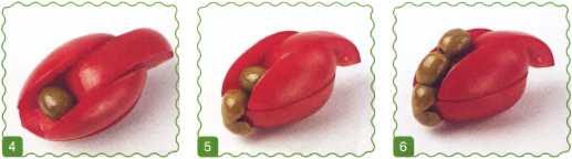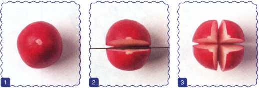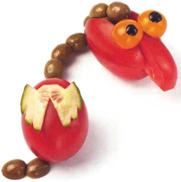 9. Помидор разрезать пополам, каждую из половинок разрезать на четверти и выложить к туловищу – это ноги.