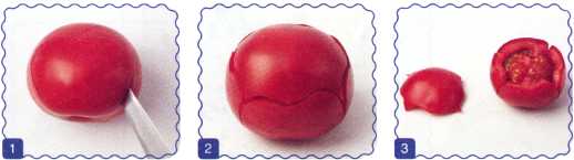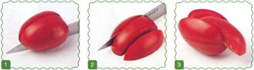 1. Разрезать помидор пополам. Одна из половинок – нижняя часть головы, другая – верхняя.