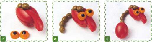 7. Сделать глаза из половинок желтого помидора. Зрачки вырезать из черной маслины.