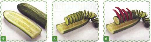 5. Из второй половины огурца вырезать спираль и уложить на ломтик огурца – это туловище дракона.