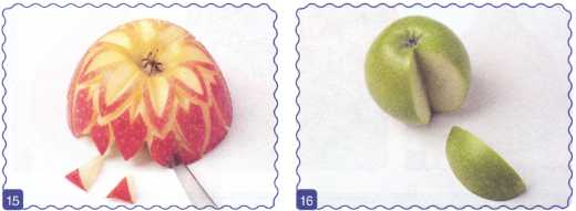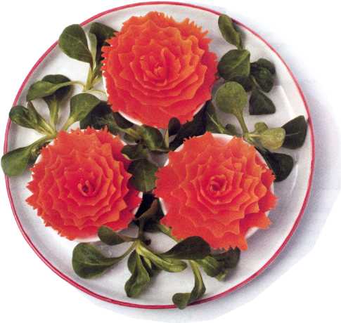Овощи и фрукты могут быть разными: самыми обычными или экзотическими. Но они обязательно должны быть свежими! Перед приготовлением их необходимо тщательно вымыть. Нож должен быть острым, поэтому будьте осторожны во время его использования. Часть книги посвящена карвингу – искусству вырезания из овощей и фруктов. Это очень интересное и увлекательное занятие. Благодаря пошаговым инструкциям и подробным фотографиям вы без труда повторите любой узор. Для карвинга используется нож с тонким узким лезвием. При вырезании контура узора сначала нужно сделать неглубокий вертикальный надрез, а затем, держа нож под углом и на небольшом расстоянии от надреза вырезать мякоть под ним. Овладев этим несложным приемом, вы сможете делать необыкновенно красивые цветы и узоры, которые украсят ваш стол и произведут неизгладимое впечатление на ваших гостей. И наконец, самый главный совет – не забудьте вложить в каждый рецепт немножко души, доброты и юмора!