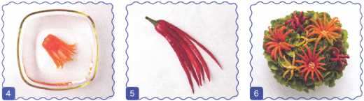 5. Перец чили разрезать на тонкие лепестки и опустить на 1 час в холодную воду.