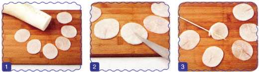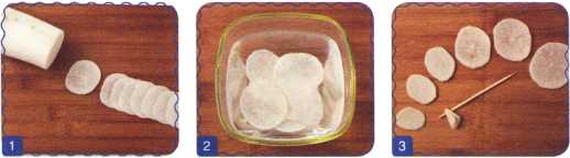 1. Редьку очистить, отрезать 6 тонких ломтиков.