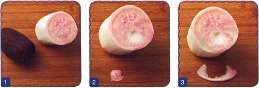 1. Редьку очистить, отрезать часть. Срез слегка окрасить очищенной свеклой.
