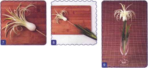 8. Вставить шпажку внутрь центрального перышка зеленого стебля лука.