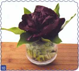 10. В широкий стакан или вазочку уложить листья зеленого салата. Вставить туда розу. Украсить листьями.