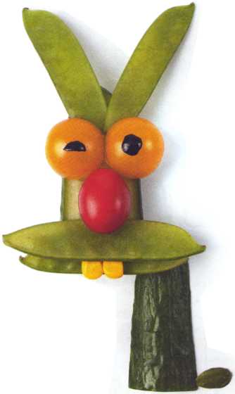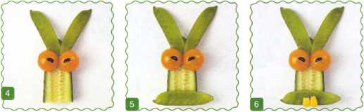 2. Средний ломтик – это голова зайца. Уложить на нее уши – стручки зеленого горошка.