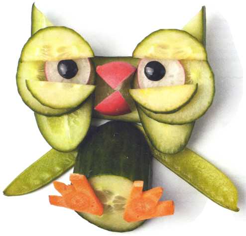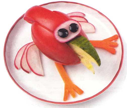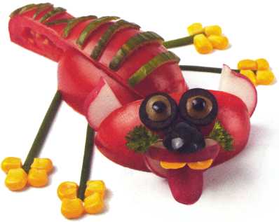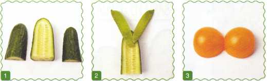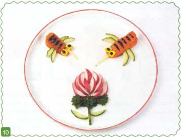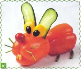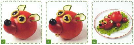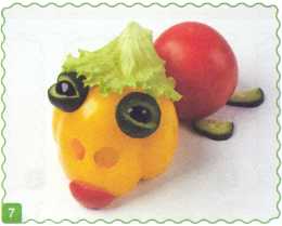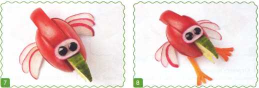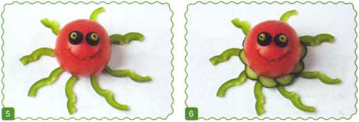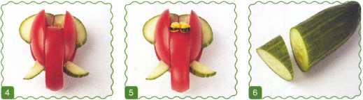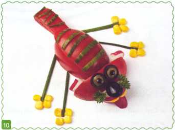 9. Выложить туловище из ломтика огурца. Хвостик вырезать из кожуры огурца.