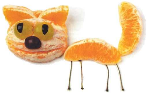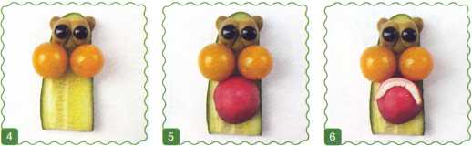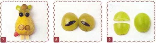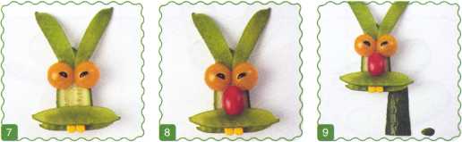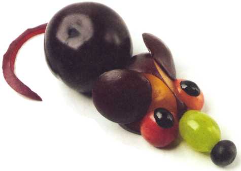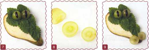 8. Ягоду винограда надрезать поперек, не дорезая до кожуры. Развернуть половинки ягоды и уложить на мордочку – это нос. Вырезать зубы из кожуры зеленого яблока.