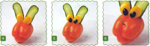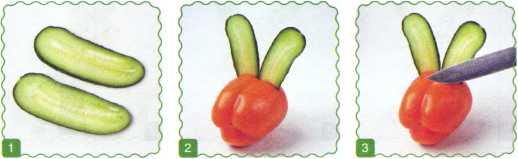 2. В перце сделать надрез и вставить уши – это голова зайца.
