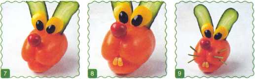 7. Сделать отверстие в помидоре и нанизать на стебель – это нос.