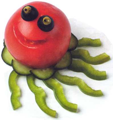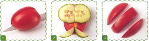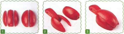 1. Разрезать помидор пополам. Одну из половинок также разрезать пополам – это голова и верхняя часть туловища. Вторую половинку разрезать на 3 части.