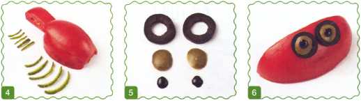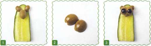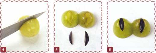 5. От маслины отрезать 2 колечка и 2 маленьких круглых ломтика – это зрачки. От оливки отрезать 2 кружочка.