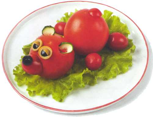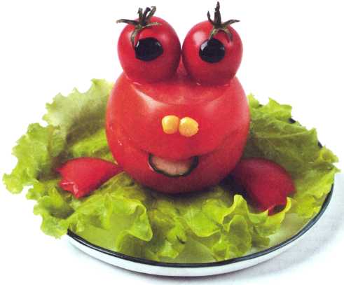 1. В большом круглом помидоре деревянной шпажкой прочертить улыбающийся рот и вырезать мякоть.