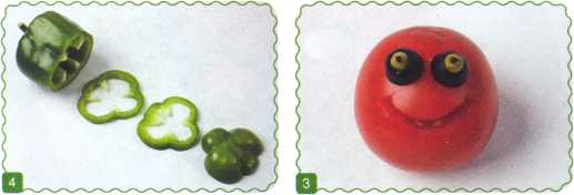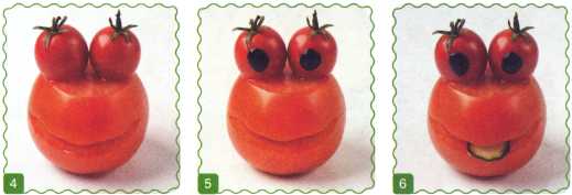 1. Помидор положить черенком вниз, деревянной шпажкой нарисовать улыбку и вырезать по контуру.