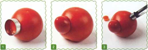1. Подобрать круглую выемку по диаметру мелкоплодного помидора, наметить ею контур и вырезать в крупном помидоре отверстие.