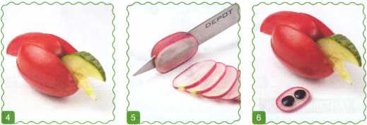 7. Половинку редиса разрезать на четверти. Вырезать сектор, как показано на фото, – это рот. Вставить зубы – половинки зернышка кукурузы. Срезать бочок у редиски – это язык.