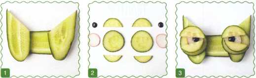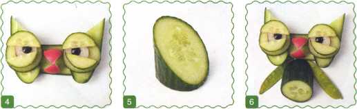 4. С кружочка огурца снять кожуру, нарезать на полоски и уложить на туловище и хвост.