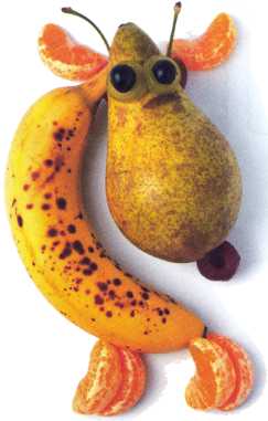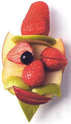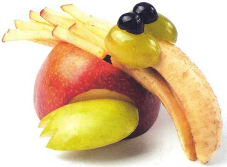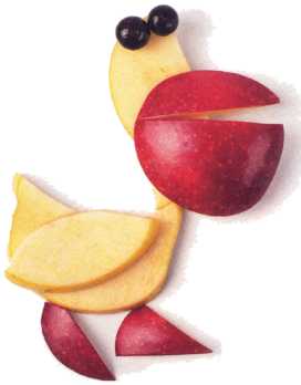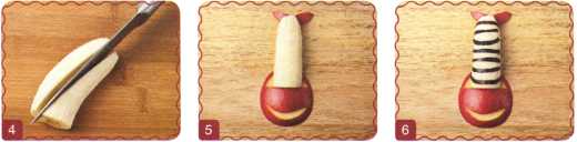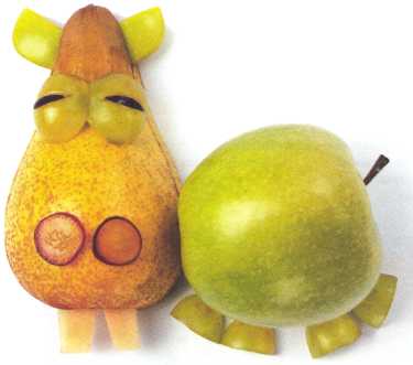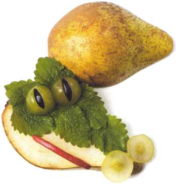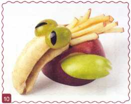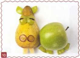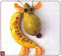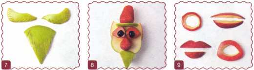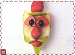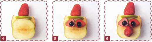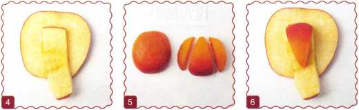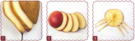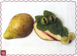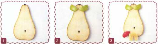 10. Из кусочка красного яблока вырезать рот. Выложить туловище – ломтик груши.