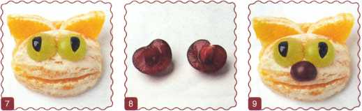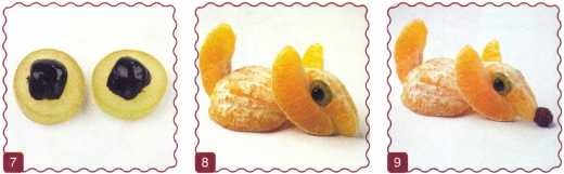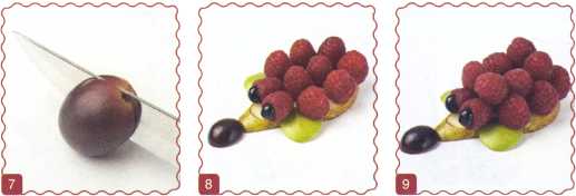 7. От ягоды винограда отрезать кончики, серединку разрезать пополам. Из ягоды черники вырезать зрачки и выложить на мордочку.