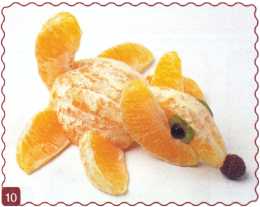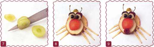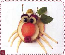 10. От ломтика яблока отрезать 5 полосок – это хвост и ноги – и приставить к туловищу.
