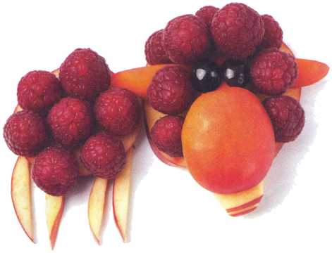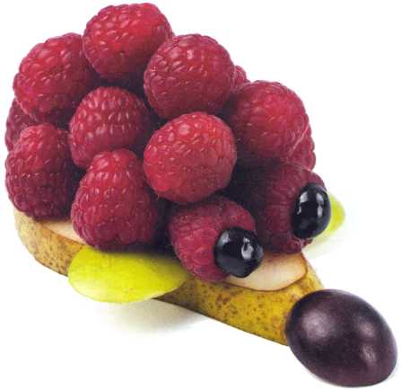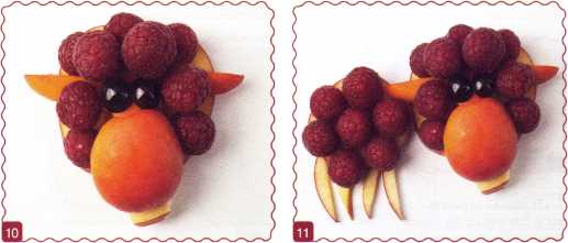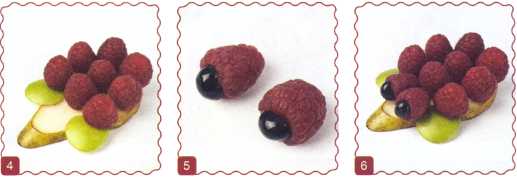 11. Выложить оставшийся ломтик яблока – туловище и уложить на него ягоды малины. Из тонкого ломтика яблока вырезать ножки.