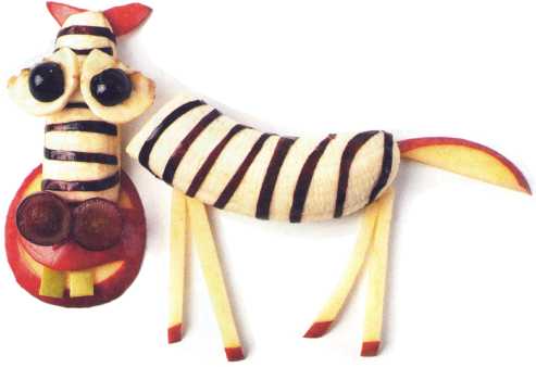 9. Вторую половинку банана выложить в виде туловища зебры. Сделать полоски из кожуры винограда.