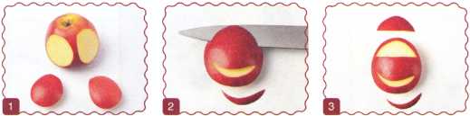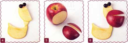 1. От красного яблока отрезать 2 круглых ломтика. В одном из них сделать горизонтальный надрез.