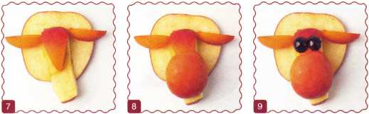 5. Из ломтика яблока вырезать уши и вставить в надрез. Уложить голову на мордочку.