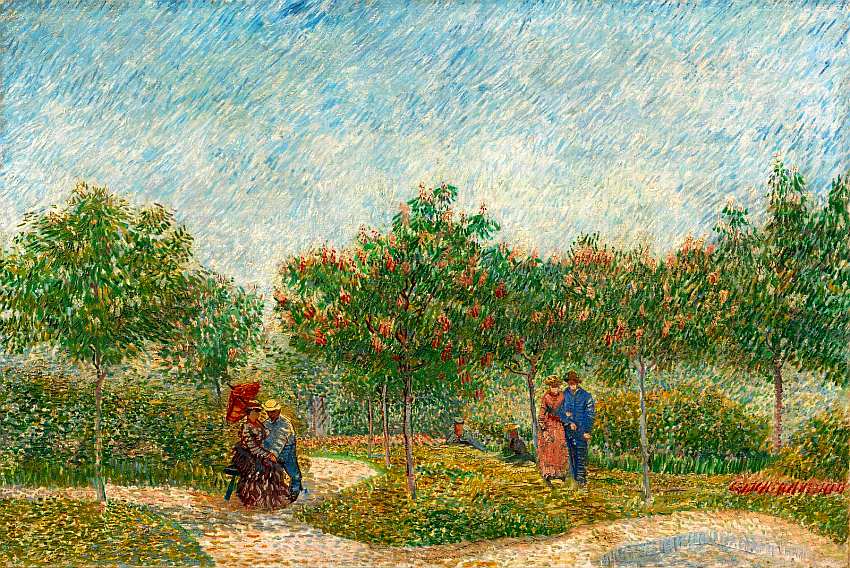 «Сад с влюбленными: площадь Сен-Пьер» Ван Гог создал во время романа с Агостиной Сегатори, владелицей кафе «Тамбурин» на Монмартре, и романтическое настроение художника передалось в этом полотне, написанном с удивительной лирической мягкостью. В светлой безмятежности атмосферы, нежности колорита, наполненности воздухом и небом – во всем здесь, несомненно, проявляется влияние пуантилизма. Однако мастер использовал не точки, а короткие и длинные мазки, наложенные в разных направлениях, он аккуратно заполнил ими цветовые зоны на поверхности картины. Его новая светлая живопись не просто изображает светящиеся туманы и легкие небеса, природу, пронизанную светом и окутанную воздухом, во всем богатстве ее несказанных колористических нюансов. Цвет все больше интересовал художника как средство ассоциативной передачи чувств и настроений. «Я попеременно поглощен двумя мыслями. Первая – это материальные трудности… вторая – работа над колоритом. Я постоянно надеюсь совершить в этой области открытие, например, выразить чувства двух влюбленных сочетанием двух дополнительных цветов, их смешением и противопоставлением, таинственной вибрацией родственных тонов. Или выразить зародившуюся в мозгу мысль сиянием светлого тона на темном фоне. Или выразить надежду мерцанием звезды, пыл души – блеском заходящего солнца…»