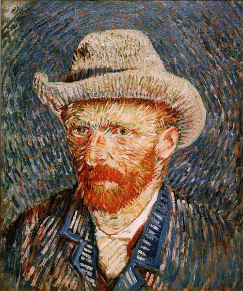На этой картине Ван Гог изображен в костюме и фетровой шляпе – спокойный, буржуазный вариант. Художник словно и не позирует, а просто показывает себя таким, каков он есть. Но в развернутой в фас голове и пронзительном взгляде зеленых глаз есть некоторая наступательность, почти агрессивность, которую усиливают резко выступающие скулы и суровая складка рта. Настоящая метаморфоза происходит с цветовым решением. Голова живописца окружена, словно ореолом, целым сонмом продолговатых голубых мазков, чередующихся с небольшими красноваторыжими вкраплениями. Голубой цвет переходит на одежду, почти не теряя интенсивности, лицо как бы излучает пламень: от носа бегут вверх, в стороны и вниз красноватые, коричневые, зеленые, желтые, белые мазки-черточки, безошибочно передающие объем и форму одним цветом, без всякой светотени. Словно внутренний огонь, сжигающий художника, прорывается наружу этими резкими, длинными, как языки пламени, мазками.