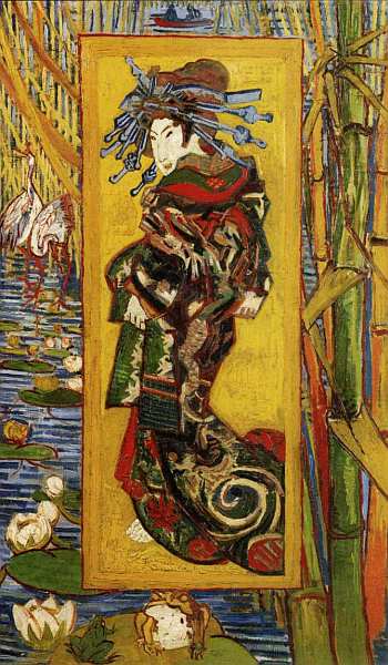 Во второй половине XIX века в Европе возникла мода на все японское. Таинственная культура Востока и раньше притягивала европейцев, но теперь, после реставрации монархии в Стране восходящего солнца и прекращения культурной изоляции, в Старый Свет хлынул поток «восточных диковин». На выставках 1873 в Вене и 1878 в Париже были впервые экспонированы произведения японских художников, после чего начался бум увлечения японской гравюрой. Судя по письмам, Ван Гог познакомился с восточным искусством еще в 1885–1886 в Антверпене – ведь именно голландцы на протяжении многих лет вели торговлю с Японией. Тогда он купил первые гравюры в свою коллекцию, а затем во французской столице с помощью брата Тео постоянно ее пополнял, регулярно наведываясь в магазинчик «папаши» Жульена Танги – торговца японской графикой. Увлечение восточным искусством Ван Гог пронес через всю свою жизнь, композиционные и колористические приемы его работ нередко обнаруживают влияние японской эстетики. В Париже он написал как копии с гравюр японских художников, так и подражания им. Сохранилось не так уж много «японских картин» Ван Гога, в их числе «Куртизанка», созданная под вдохновением от литографии знаменитого мастера ксилографии Кацусики Хокусая. Женская фигура повторена с обложки журнала, а декоративный пейзажный фон создан фантазией живописца, стилизовавшего его под японскую манеру.