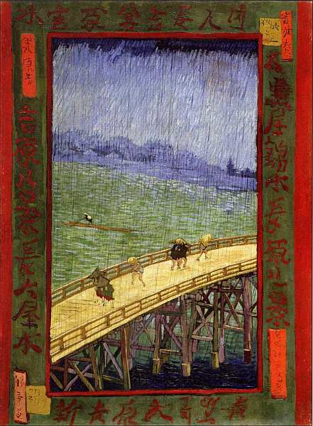 Настоящим открытием для Ван Гога стали японские литографии направления укиё-э (дословно – «картины плывущего мира»). Его работа «Мост под дождем» (по мотивам произведений Андо Хиросигэ из серии «Сто знаменитых видов Эдо») – пример подобного увлечения. Вдохновитель художника – выдающийся мастер цветной ксилографии, крупнейший представитель направления укиё-э, разработавший тип камерного, проникнутого тонким лирическим чувством пейзажа. Хиросигэ виртуозно передавал зыбкие, преходящие состояния природы, часто обращаясь к мотивам снега, тумана, дождя. Само название искусства укиё-э указывает на его стремление отражать повседневную жизнь во всем ее многообразии. Названная серия была очень популярна в Европе и оказала огромное влияние на многих французских художников. Ван Гог копировал несколько ее гравюр, изучая их композиционные приемы и структуру.