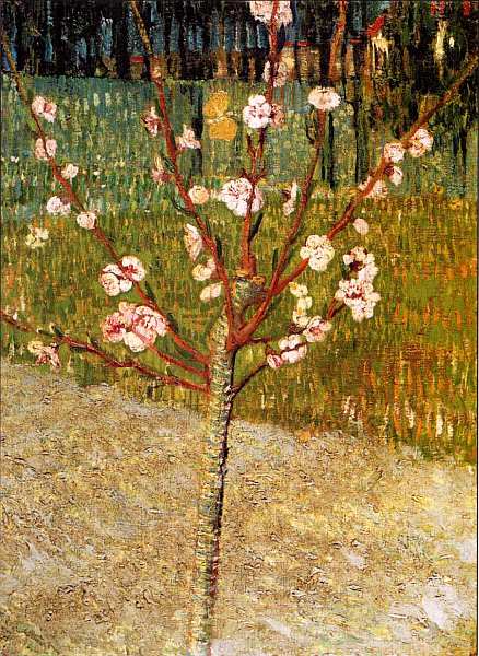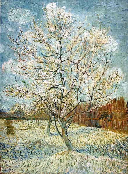 Ван Гог писал сестре: «Я себе все время представляю, что здесь я в Японии, что мне нужно просто держать глаза хорошо открытыми и что нужно только и писать то, что из находящегося со мной в непосредственной близости производит на меня особое впечатление». Теперь он стремился включить свою жизнь в круговорот южной природы Прованса, отныне игравшего роль воображаемой Японии. Февраль, когда художник приехал в Арль, выдался необычайно холодным, со снегом, а теперь мастер радовался первому вестнику весны – сучковатой веточке миндаля, распустившейся еще в стакане. Эти едва раскрывшиеся бутоны обрели для него тот же символический смысл, что и ветка цветущей вишни для каждого японца, они означали наступление весны, радостного обновления мира. Очень скоро два маленьких этюда с веточками разрослись в огромную серию картин, в которой с невиданной дотоле мощью воплотилось весеннее цветение Прованса: сначала розовых персиков и миндаля, потом бледно-желтых груш и бело-розовых абрикосов.