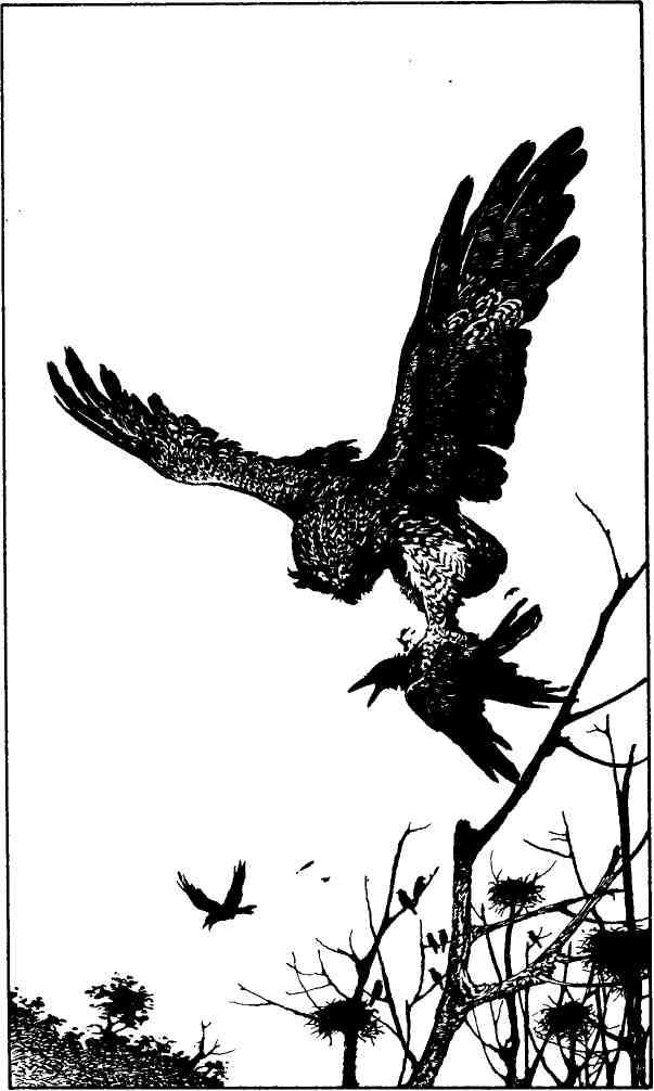На островке посреди реки стоят большие деревья, это стародавняя воронья колония, где чернеют одно подле другого несколько тысяч гнезд, и столь же давнее место охоты для филинов. Сколько Ху ни таскает отсюда ворон, колония их не уменьшается, а ведь напротив, в расщелине другой скалы, гнездится пара соколов и тоже питается воронами. Но не будь здесь филина и соколов, воронам, пожалуй, и не уместиться всем на одном острове, пришлось бы им тогда основывать еще одну колонию, или же не миновать бы им какой-нибудь из болезней, которые всегда возникают в местах, где чрезмерно скучились слишком расплодившиеся звери или птицы. Природа сохраняет равновесие, и филин Ху со своим семейством, хотя, конечно, он об этом даже не подозревает, есть орудие этого равновесия…