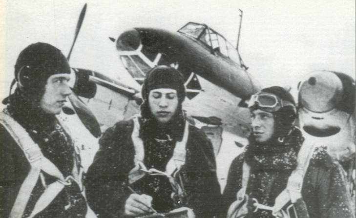 Экипаж лучшего пикировщика ВВС Северного флота. Слева направо: штурман – лейтенант М.И.Шамаев, командир экипажа – старший лейтенант И.В.Гаркушенко и стрелок-радист – сержант А.Жук. Зима 1941 – 1942 гг.