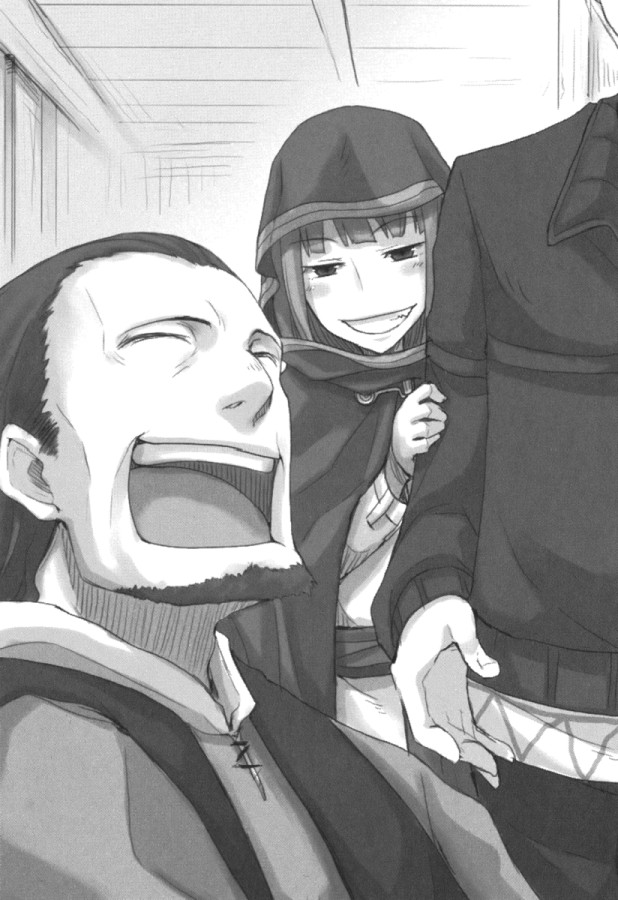 Так или иначе, Хоро в ответ изобразила неловкость. Ее ум был не менее остер, чем у торговцев, и она явно ухватила намерение Рейнольдса. Как только он спросил, Хоро прижалась к Лоуренсу. Ну просто вылитая робкая девушка, полагающаяся на Лоуренса как на своего защитника.