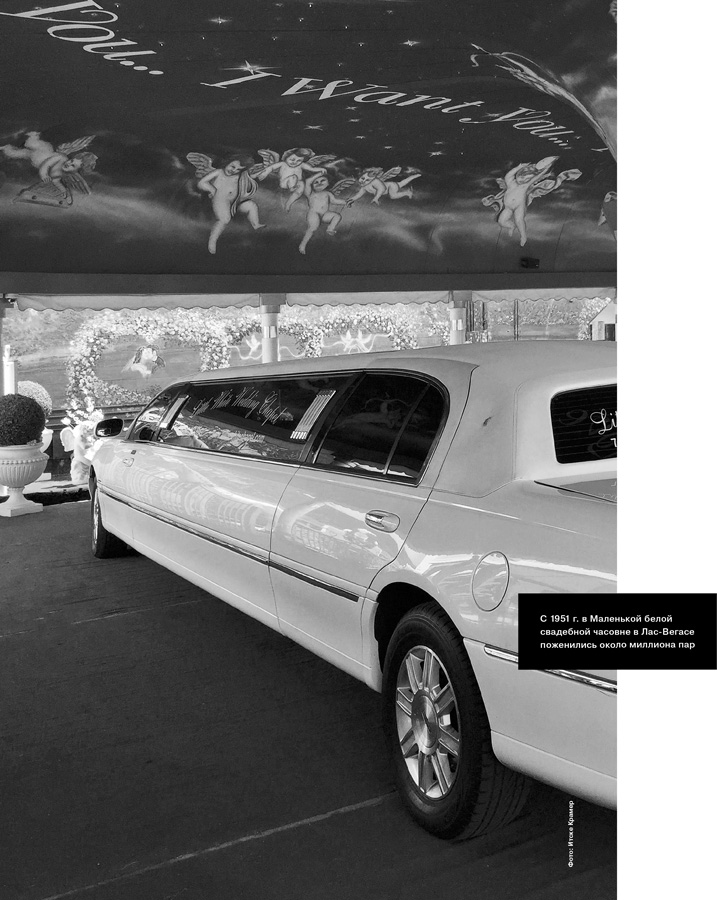 Лас-Вегас, свадебную столицу мира, также называют Городом греха. Мне интересно, как эти два понятия уживаются вместе. У каждого отеля на бульваре Лас-Вегас-Стрип есть своя часовня. Я заглянула в некоторые из них: аккуратные залы с красивыми коврами, стульями, цветами, фортепиано и декором, который ассоциируется с американской свадьбой. Сюда съезжаются люди со всего мира, чтобы жениться, иногда только вдвоем, втайне от всех или нет – не важно. Иногда всей семьей, воспользовавшись «пакетными предложениями» – «Легко, удобно, весело и без нервотрепки!» – обещают брошюры. Последнее, как говорили наугад опрошенные посетители Вегаса, – самая главная причина жениться именно здесь. Вот что рассказывает 45-летняя жительница Западного побережья (примерно в четырех часах езды отсюда): «Много лет назад у меня была традиционная свадьба. Вы даже не представляете, сколько сил и нервов стоило сделать этот день идеальным! Это почти разрушило наши отношения. Теперь я советую всем друзьям: “Езжайте в Вегас!” Они так и поступают. Все просто: назначьте дату, сделайте пару звонков и пригласите всех друзей повеселиться вместе с вами!» Хотя ее беспокоит количество разводов: «Говорят, более 70 %! Да, возможно, сегодня пожениться стало слишком просто».