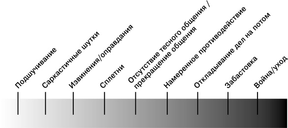 Шкала саботажа – инструмент диагностики, помогающий понять, насколько хорошо группа справляется с существованием различий. Она описывает стадии саботажа, характерные для группы. Слева на ниже приведенной шкале показаны скрытые проявления саботирующего поведения, которые по мере продвижения вправо становятся все более явными. В поведении конкретного человека они не всегда проявляются именно в такой очередности, однако открытой форме саботажа всегда предшествуют скрытые сигналы. Как такое поведение выглядит на практике, зависит от ситуации, предыстории, членов группы, обстоятельств и культурного контекста.